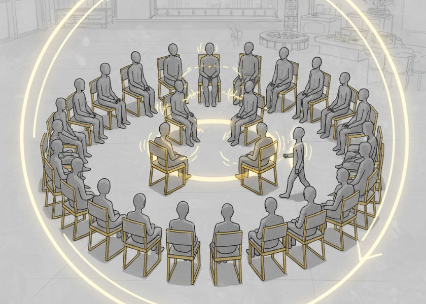 The mostly-vacant, inner-circle seat is a powerful signal to the entire group that there’s always room for another voice, even if that voice has something simple / quick to add.